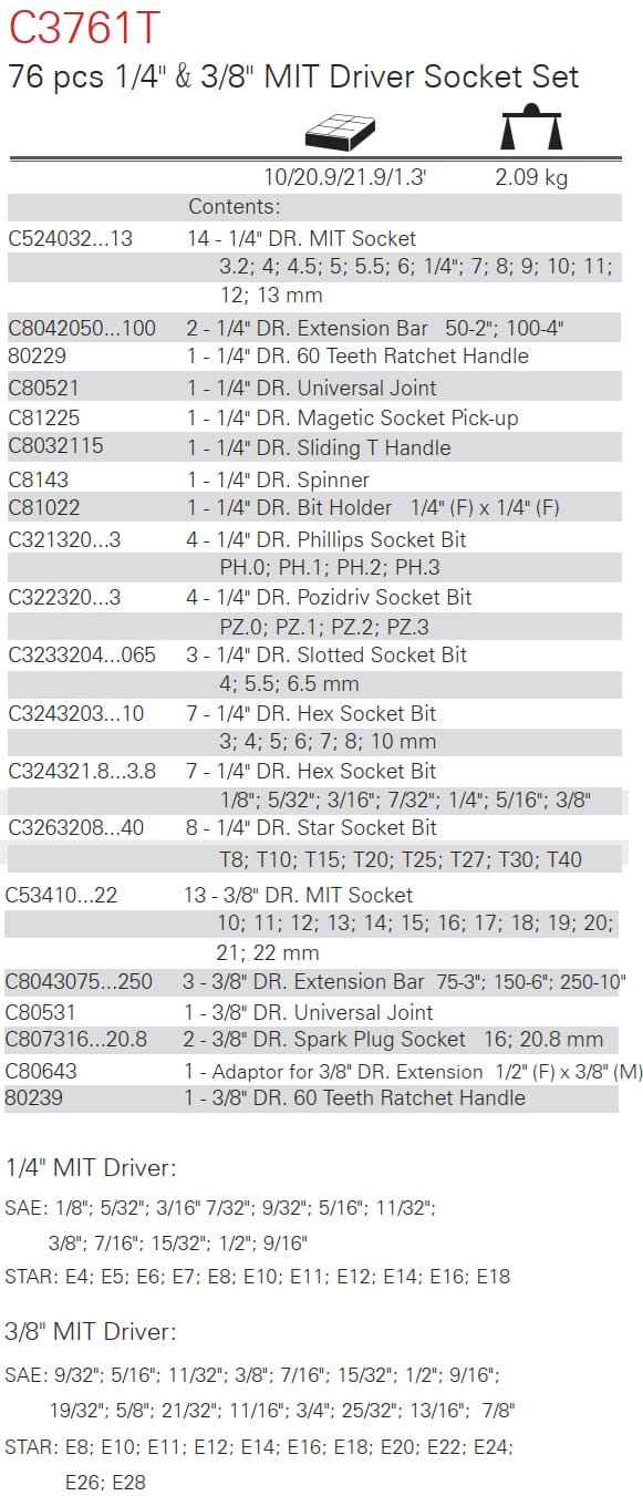 Bộ tuýp hệ inch và hệ mét 76 chi tiết hệ mét Pard C3761T