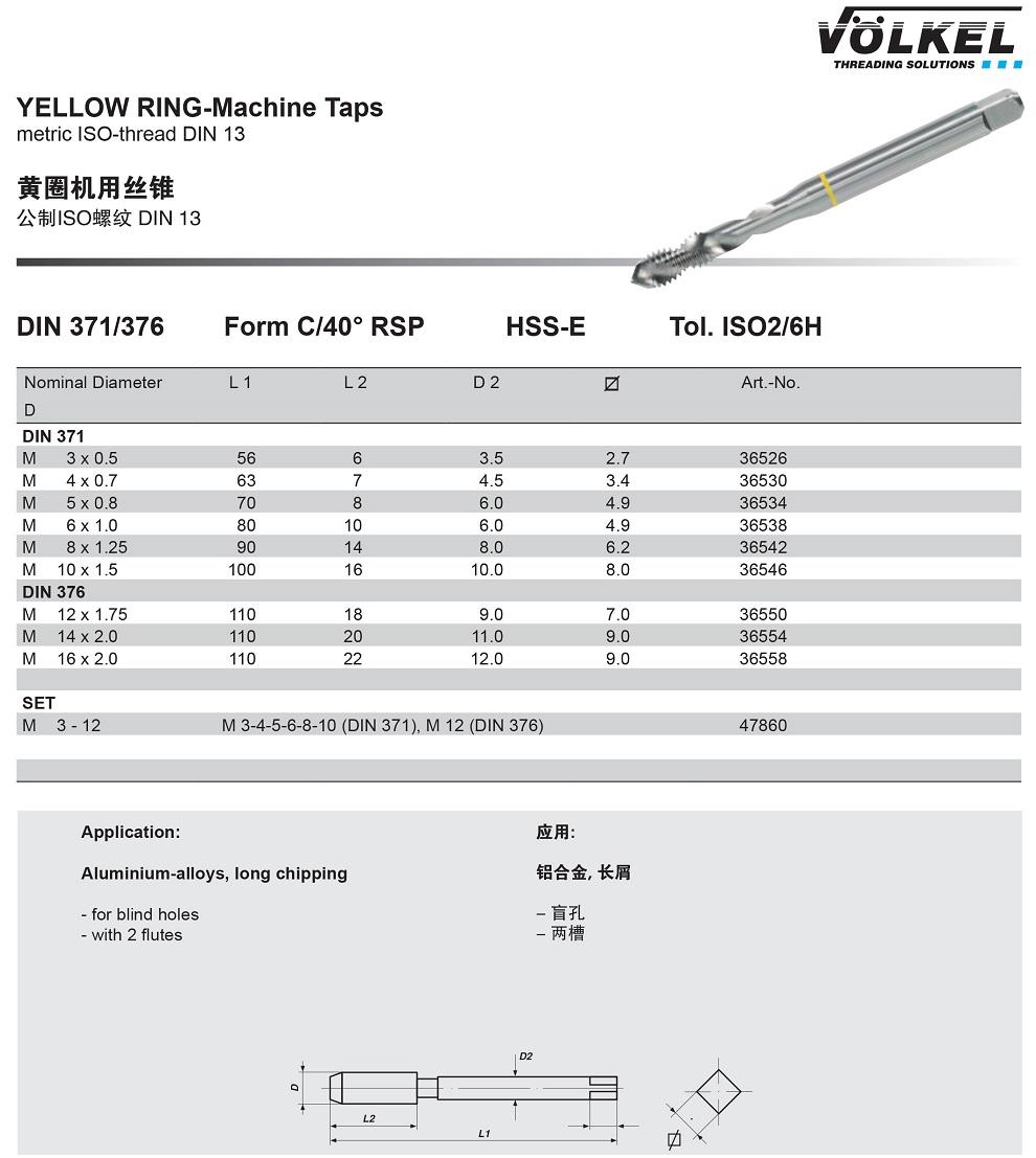 – Taro máy vòng vàng Volkel 365 là mũi taro ren xoắn, Vật liệu làm mũi taro là HSS-E (thép gió coban), Dung sai ISO2/6H chuyên dùng cho taro nhiều loại vật liệu nhôm…